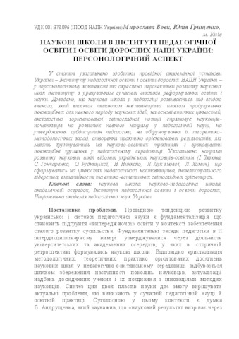 - Вовк, М.П. (orcid.org/0000-0002-9109-9194) and Грищенко, Ю.В. (orcid.org/0000-0002-9822-9668) (2017) Scientific schools in the Institute of pedagogical and adult education of the National academy of pedagogical sciences of Ukraine Естетика і етика педагогічної дії (15). pp. 141-152. ISSN 2226-4051