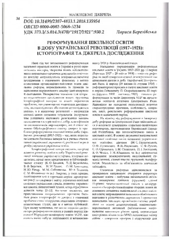 - Березівська, Лариса Дмитрівна (orcid.org/0000-0002-5068-5234) (2018) The school education reform during the Ukrainian revolution period (1917-1921): historiography and sources of study Історико-педагогічний альманах, 1 (26). pp. 34-42. ISSN 2307-4833
