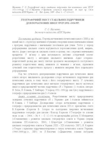 - Науменко, С.О. (2009) The geographical content of the stable textbooks for the primary schools of the Ukrainian Soviet Socialist Republic in 1931-1950’s years Проблеми сучасного підручника (9). pp. 629-635. ISSN 2411-1309