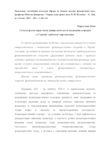 - Вовк, М.П. (2015) Modern folklore university and academic centers in Ukraine: achievements and prospects Подвижник: ювілейний науковий збірник на пошану доктора філологічних наук, професора Миколи Дмитренка. pp. 426-440.