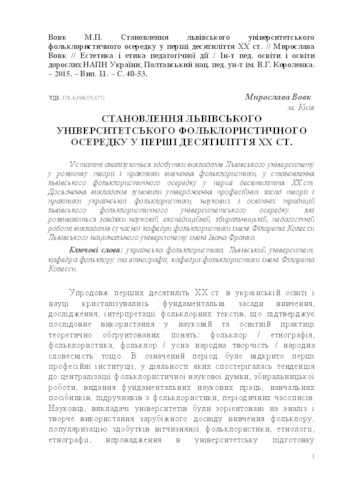 - Вовк, М.П. (2015) Beginning of the Lviv university folclore centre in the first decades of the XX century Естетика і етика педагогічної дії, 11. pp. 40-53. ISSN 226-4051