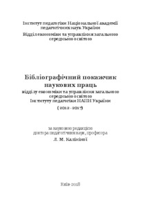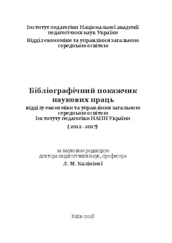 In the bibliographical index systematized publications of scientific staff, doctoral students, postgraduates and applicants of the department of economics and management of general secondary education at the Institute of Pedagogy of NAPN of Ukraine for 2012-2017years. The publication is addressed to the scientific-pedagogical and pedagogical workers, doctoral students, postgraduate students, heads of educational authorities, employees of local self-government bodies, employees of OTG, heads of educational establishments of ZSO, students of institutions of postgraduate education, library staff, partners of the Department of Economics and Management of ZSO of the Institute of Pedagogic of the National Academy of Sciences of Ukraine, undergraduates and students of management specialization and all those who are interested in the development of the theory and methodology of education management in Ukraine.