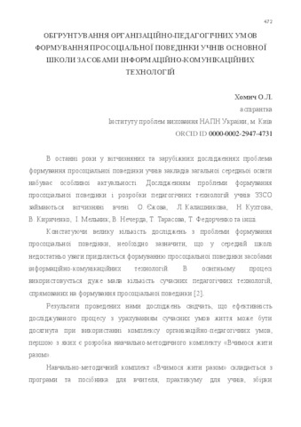 - Хомич, О. Л. (orcid.org/0000-0002-2947-4731) (2018) Substantiation of the organizational and pedagogical conditions for the formation of prosocial behavior of pupils of the basic school by means of information and communication technologies In: Сучасний рух науки: тези доп. II міжнародної науково-практичної інтернет-конференції . WayScience, м. Дніпро, Україна, pp. 472-474.