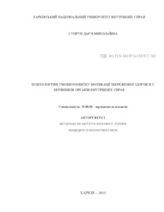 - Супрун, Д. М. (orcid.org/0000-0003-4725-094X) (2011) The Psychological conditions of the development of the health saving motivation of the leaders of organs of internal affairs Dissertation candidate2 thesis, Харківський національний університет внутрішніх справ.