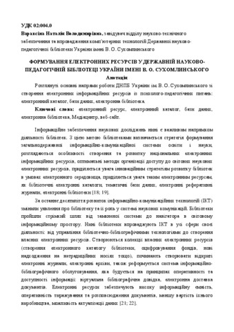 - Вараксіна, Наталія Володимирівна (orcid.org/0000-0002-0333-5186) (2008) Forming of electronic resources in the State scientific pedagogical library of Ukraine in the name of V. O. Sukhomlynskiy Інформаційні технології і засоби навчання, 1 (5). ISSN 2076-8184