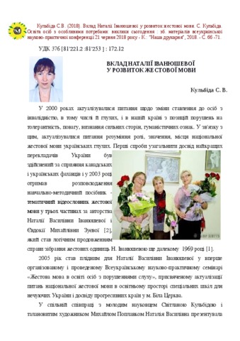 - Кульбіда, С.В. (2018) Natalia Ivanyusheva's contribution to the development of sign language Освіта осіб з особливими потребами: виклики сьогодення : зб. матеріалів всеукраїнської науково-практичної конференції 21 червня 2018 року. pp. 66-71.