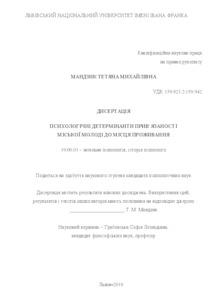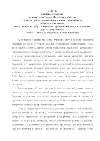 - Мандзик, Тетяна Михайлівна (2018) Psychological determinants of urban youth attachment to place of residence Dissertation candidate thesis, Інститут соціальної та політичної психології.