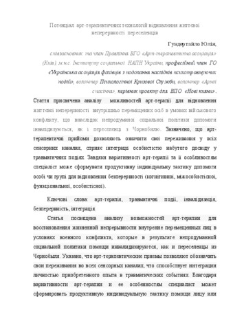 This article analyzes the possibilities of art therapy for restoration of vital continuity of internally displaced persons in conditions of armed conflict, which as a result of ill-conceived policy of social assistance disabling as migrants from Chernobyl. It is indicated that the art therapy techniques allow to identify their experiences in all sensory channels, which contributes to the integration of the personality of the experience gained in traumatic events. Due to the variability of art therapy and its features expert can form a productive individual tactics help a person or group to restore the continuity of (cognitive, interpersonal, functional, personal).