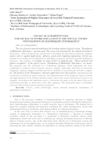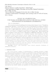- Markova, Oksana (orcid.org/0000-0002-5236-6640), Semerikov, Serhiy O. (orcid.org/0000-0003-0789-0272) and Popel, M.V. (orcid.org/0000-0002-8087-962X) (2018) СoCalc as a Learning Tool for Neural Network Simulation in the Special Course “Foundations of Mathematic Informatics” Informational Technologies in Education, 3 (36). pp. 58-70. ISSN 1998-6939