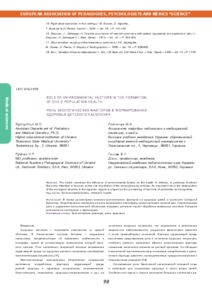 - Ризничук, М.О. (orcid.org/0000-0002-3632-2138) and Пішак, В.П. (orcid.org/0000-0002-0637-6936) (2017) Role of environmental factors in the formation of child population health The unity of science, 2 (10). pp. 1-130. ISSN 9091-1792