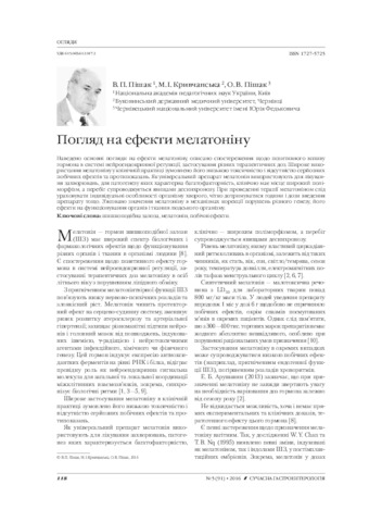 - Пішак, В.П. (orcid.org/0000-0002-0637-6936), Кривчанська, М.І. (orcid.org/0000-0003-3425-8125) and Пішак, О.В. (orcid.org/0000-0002-7208-8588) (2016) A look at the melatonin effects Сучасна гастроентерологія, 5 (91). pp. 1-130. ISSN 1727-5725