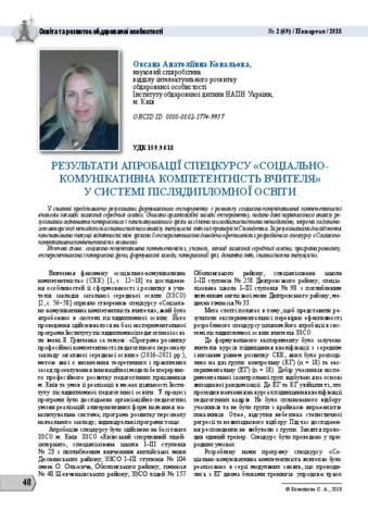 - Ковальова, О.А. (orcid.org/0000-0002-1774-9937) (2018) Results of Approbation of Special Course “Social and Communicative Competency of Teacher” in the System of Postgraduate Education Education and Development of Gifted personality, 2 (69). pp. 48-54. ISSN 2309-3935