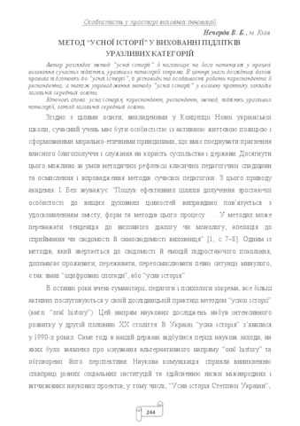- Нечерда, В. Б. (2018) The method of "oral history" in the education of adolescents of vulnerable categories In: Особистість у просторі виховних інновацій : матеріали Всеукр. наук.-практ. конф. Ін-ту проблем виховання НАПН України за 2018 рік . НАІР, м. Івано-Франківськ, Україна, pp. 244-251. ISBN 978-966-2716-99-3