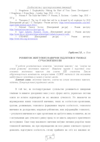 - Гарбузюк, І.В. (2018) Development of life skills of adolescents in a modern school environment In: Особистість у просторі виховних інновацій : матеріали Всеукр. наук.-практ. конф. Ін-ту проблем виховання НАПН України за 2018 рік . НАІР, м. Івано-Франківськ, Україна, pp. 73-76. ISBN 978-966-2716-99-3