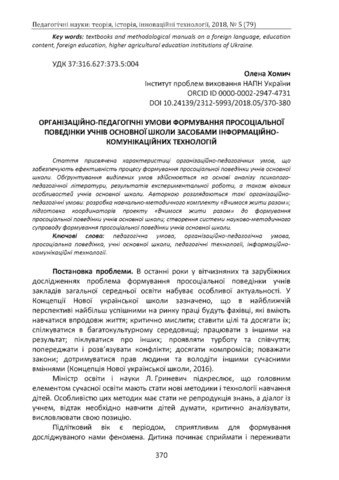 - Хомич, О. Л. (2018) Organizational-pedagogical conditions in the formation of prosocial behavior of students in the secondary school through using information and communication technologies Педагогічні науки: теорія, історія, інноваційні технології, 5 (79). pp. 370-380. ISSN 2312-5993