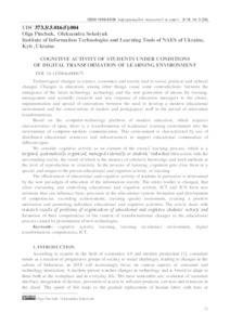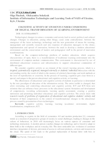 - Pinchuk, O. P. (orcid.org/0000-0002-2770-0838) and Sokolyuk, Oleksandra (orcid.org/0000-0002-5963-760X) (2018) Cognitive activity of students under conditions of digital transformation of learning environment Інформаційні технології в освіті, 3 (36). pp. 71-81. ISSN 1998-6939