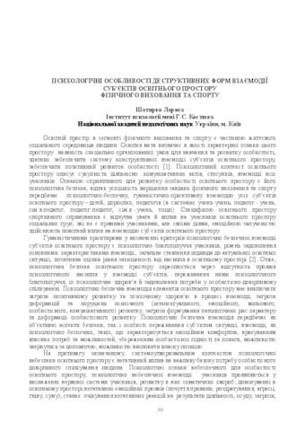 - Шатирко, Л.О. (orcid.org/0000-0002-1953-0656) (2018) Psychological features of destructive forms of interaction of subjects of educational space of physical education and sports In: Actual problems of psychological and pedagogical support and development of subjects of sports activity: Materials of the I all-Ukrainian scientific conference (Kyiv, October 19, 2018) . Національний університет фізичного виховання і спорту України, м. Київ, Україна, pp. 39-40.