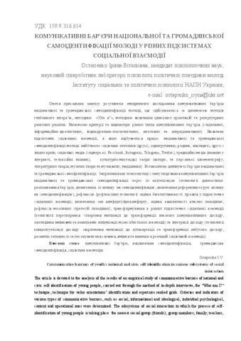 - Остапенко, Ірина Віталіївна (orcid.org/0000-0001-6710-5964) (2018) Communicative barriers of youth’s national and civic self-identification in various subsystems of social interaction Наукові студії із соціальної та політичної психології, 1 (41) (44). pp. 115-125. ISSN 2309-8287