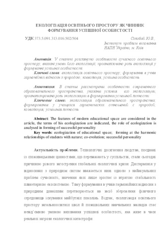 Solobai ЕКОЛОГІЗАЦІЯ ОСВІТНЬОГО ПРОСТОРУ ЯК ЧИННИК ФОРМУВАННЯ УСПІШНОЇ ОСОБИСТОСТІ.pdf Download (451kB) | Preview |