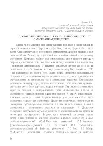 - Бучма, Вікторія Володимирівна (orcid.org/0000-0001-6163-0223) (2018) Dialogic communication as a factor of personal self-realization of adolescents Psychological dimensions of personal interaction of subjects of educational space in the context of the humanistic paradigm: materials of the all-Ukrainian conference with international participation (may 31, 2018, Kyiv). pp. 36-42. ISSN ISBN 978-617-571-157-6