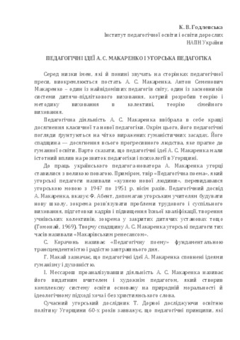 - Годлевська, К.В. (2018) Pedagogical ideas A. S. Makarenko and Hungarian pedagogy In: IІ Міжнародна науково-практична конференція "Творча спадщина А.С.Макаренка в контексті інноваційного розвитку освіти ХХІ століття" . Сумський державний педагогічний університет імені А.С.Макаренка, м. Суми, Україна, pp. 249-251. ISBN 978-966-698-257-8