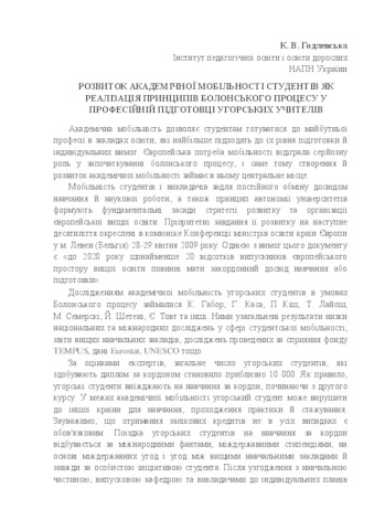- Годлевська, К.В. (2017) Development of Academic Mobility of Students as Implementation of the Bologna Process Principles in the Professional Training of Hungarian Teachers In: Інноваційний розвиток вищої освіти: глобальний та національний виміри змін: матеріали IV Міжнародної науково-практичної конференції (06-07 квітня 2017 року, м. Суми) . Вид-во СумДПУ імені А. С. Макаренка, м. Суми, Україна, pp. 114-116. ISBN 978-966-698-237-0