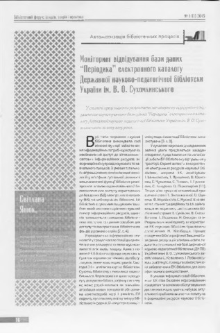 - Янюк, С. С. (orcid.org/0000-0002-5628-5346) (2015) Monitoring of visits of Periodicals database presented in e-catalogue of V.O. Sukhomlynskyi State Scientific and Pedagogical Library of Ukraine Бібліотечний форум: історія, теорія і практика, 1 (1) (20). pp. 16-21.