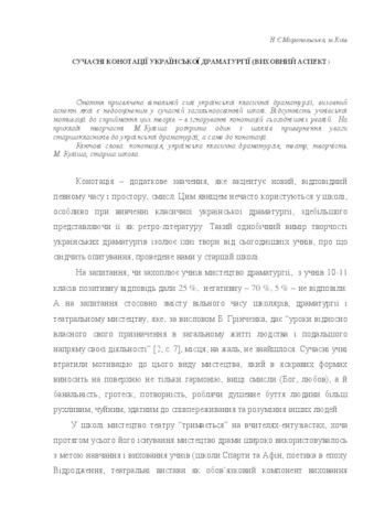 - Миропольська, Н.Є. (orcid.org/0000-0002-7469-5111) (2018) Modern connotations of Ukrainian drama (educational aspect) Особистість у просторі виховних іновацій. pp. 234-238. ISSN 978-966-2716-99-3
