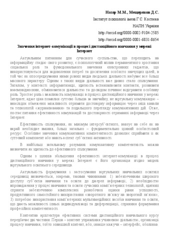 - Назар, Максим Миколайович (orcid.org/0000-0002-9104-2585) and Мещеряков, Дмитро Сергійович (orcid.org/0000-0001-6831-8654) (2018) The importance of Internet communication in the process of distance learning In: Віртуальний освітній простір: психологічні проблеми : VI Міжнародна науково-практична інтернет-конференція, 15 жовтня - 15 листопада 2018 р, м. Київ, Україна.