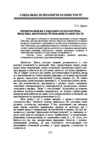 - Ларіна, Тетяна Олексіївна (orcid.org/0000-0001-8975-3348) (2013) Risk as a socio-psychological practice of person-building life-style Наукові студії із соціальної та політичної психології, 32 (35). pp. 128-135.
