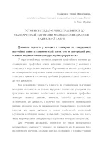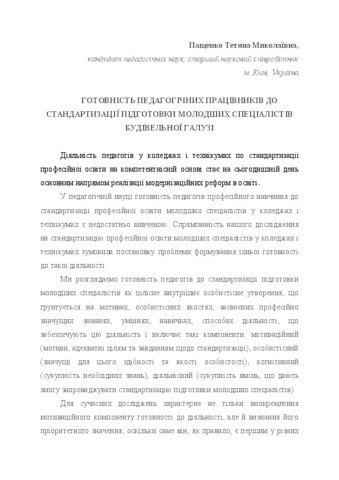 The article examines the components of teachers' readiness to standardize the training of junior specialists: motivational, personal, cognitive, activity. Introduction - In the pedagogical science the readiness of teachers of vocational training to standardize vocational education of junior specialists in colleges and technical schools is not sufficiently studied. Purpose - The purpose of the article is to substantiate the structure of teachers' readiness for standardization on the competence basis of professional education of junior specialists in colleges and technical schools. Methods - a diagnostic tool for determining the levels of preparedness of teachers for the standardization of training junior specialists in colleges and technical schools: questionnaires, questionnaires adapted to the conditions of the study, standardized and projective tests. Results - data on the formation of readiness levels for the standardization of training of junior specialists in the teachers of colleges and technical schools of the agrarian, construction and engineering industries are given. Originality - In the course of the study, it was specified: the criteria and corresponding indicators of the readiness of the teacher to be standardized for the training of junior specialists in colleges and technical schools; on the basis of the analysis of qualitative and quantitative manifestations, four levels are distinguished: low, medium, sufficient, high. Conclusion - a high level of readiness for the standardization of education on a competent basis is formed in a very limited circle of teachers, demonstrates the need for organizing special work for its purposeful formation. In particular, the actual directions of the solution of this problem are the training of teachers in the process of raising the pedagogical qualification and training of students - future teachers.