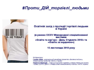 - Грудко, Лілія Михайлівна and Наумова, Вікторія Юріївна (orcid.org/0000-0002-0114-4749) (2018) Educational event to counteraction of trafficking in human beings in Ukraine (within of the XXXIV International Specialized Exhibition «Education and Career - Student's Day 2018» and «Education Abroad»), November 15, 2018 In: XXXIV Міжнародна спеціалізована виставка «Освіта та кар’єра – День студента 2018» та «Освіта за кордоном», 15.11.2018, м. Київ, Україна. (Unpublished)