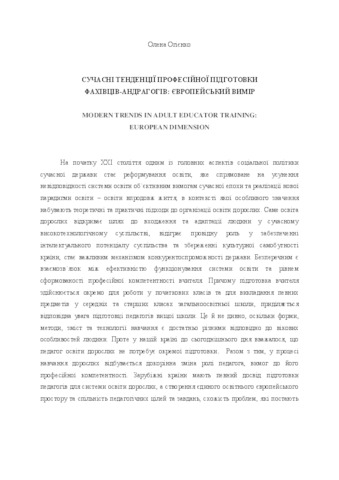 - Огієнко, О.І. (2017) Modern trends in adult educator training: European dimension Професійна і неперервна освіта: польсько-український науковий щорічник (2). pp. 509-521. ISSN 2543-7925