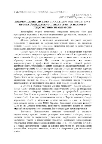 The aim of the work is to study the possibilities of integration of cloud technologies in the scientific and scientific-pedagogical process on the example of Google Apps for Education system, to identify the advantages of its application by scientists, teachers and students. Google Apps for Education is a free package of specialized cloud software and tools that Google provides for academic institutions and educational institutions on their chosen domain. This is a system of tools that can be used in the professional activities of teachers: teamwork, document management, management of educational institutions and educational process remotely.