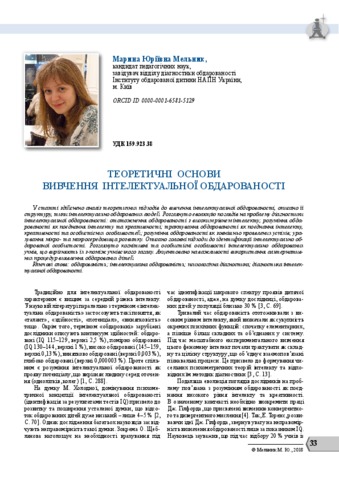 - Мельник, Марина Юріївна (orcid.org/0000-0001-6581-5129) (2018) Theoretical Approaches to Study of Intellectual Giftedness Education and Development of Gifted personality, 3 (70). pp. 33-39. ISSN 2309 ‑3935