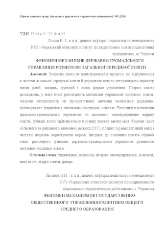 Attention is paid to the transformational processes taking place in the system of general secondary education and its management and determine the nature of the change of objectives, tasks, functions and the very form of management. The analysis of researches in which scientists consider mechanisms of management of the education system is given, in particular, they emphasize the priority importance of mechanisms of state and public administration for general secondary education at the present stage of development of a democratic society. The mechanisms of state and public administration and local self-government of the education department are considered, functions of which are carried out in different conditions of small towns of Ukraine (towns of oblast and rayon significance, urban OTG); the terminology analysis of the frequency of hits of Internet users to the main concepts of the chosen topic is given; the phenomenon of state and public administration for the development of general secondary education is considered, as well as author's views on involving the public in the implementation of educational policy, the formation of competencies not only of managerial personnel of institutions and educational institutions, but also leaders of public organizations for work in conditions of state and public administration. The author convinces that the proposed form of management should be aimed at creating a qualitative innovative educational space for the development of general secondary education and moral values, trust in small towns of Ukraine. The mechanism for their implementation should cover all structures: school, business, community as a whole. At the same time, educational institutions may have different readiness to implement mechanisms of state and public administration, and therefore proposes to systematically analyze the progress of implementation of state and public administration according to certain indicators. It points out that an important mechanism of state and public administration of the department of education for the development of ZSO may be the mechanism of project management, it is important that they are innovative in nature and ensure the development of all administrative structures and various spheres of life of the community of the city; observes that successful implementation of the projects requires both competent management and public control over their implementation, and a combination of mechanisms for influencing human development as an individual, and its socialization in the educational educational space becomes a sign of partnership.