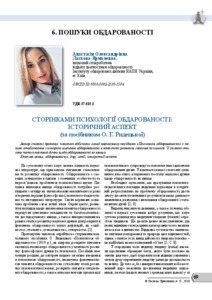 - Ласкова-Ярмоленко, Анастасія Олександрівна (orcid.org/0000-0002-2530-5586) (2018) Through the Pages of Psychology of Giftedness: Historical Aspects (according tutorial by O. Rydetska) Education and Development of Gifted personality, 3 (70). pp. 69-73. ISSN 2309 ‑3935