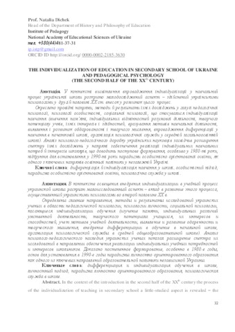 - Dichek, N.P. (orcid.org/0000-0002-2185-3630) (2018) The Individualization of Education in Secondary School of Ukraine and Pedagogical Psychology (the second half of the XXth century) Education: Modern Discourses (1). pp. 32-41. ISSN 2617-3107 (Print), 2617-7811 (Online)