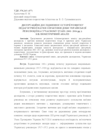 Dissertational research on the history of development of pedagogical science and practice of the period of the Ukrainian revolution at the present stage (2001-2016): bibliometric analysis (deposited 21 Nov 2018 13:56)