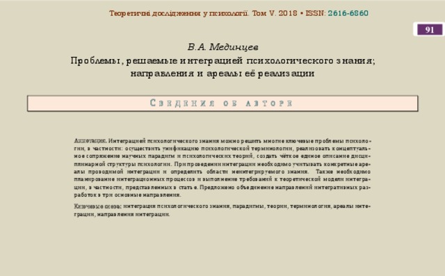 - Мєдінцев, Владислав Олександрович (orcid.org/0000-0002-5171-0139) (2018) Problems solved by the psychological knowledge integration; directions and areas of its implementation Теоретичні дослідження у психології (5). pp. 91-111. ISSN 2616-6860