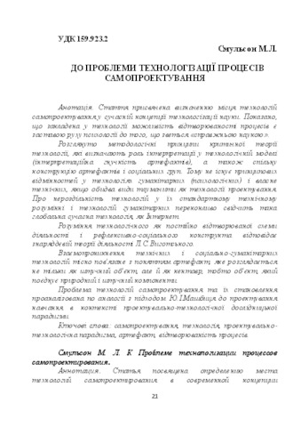 - Смульсон, Марина Лазарівна (2018) Аbout the problem of self-designing processes technologization. Актуальні проблеми психології. Т.2. Психологічна герменевтика, 1 (11). pp. 21-36. ISSN 2072-4772