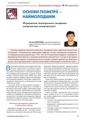 - Листопад, Наталія Петрівна (2016) The formation of the geometric aspect of mathematical competency of the peuple Учитель початкової школи, 4 (35). pp. 9-12.