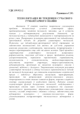 - Рудницька, Світлана Юріївна (2018) Technologization as a trend of modern humanitarian knowledge Актуальні проблеми психології. Т.2. Психологічна герменевтика, 1 (11). pp. 37-52. ISSN 2072-4772