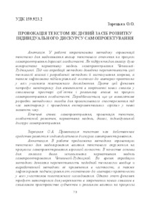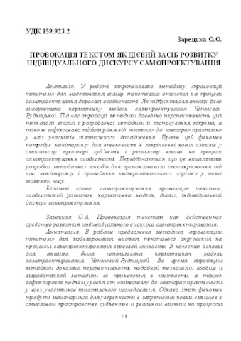 - Зарецька, О.О. (2018) Provocation by text as an effective means of developing personal self-designing discourse Актуальні проблеми психології. Т.2. Психологічна герменевтика, 1 (11). pp. 73-85. ISSN 2072-4772
