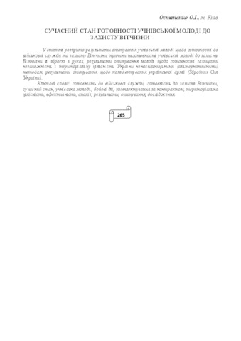 - Остапенко, О.І. (2018) The current state of readiness of student youth to protect the Fatherland Особистість у просторі виховних інновацій. pp. 265-270. ISSN 978-966-2716-99-3