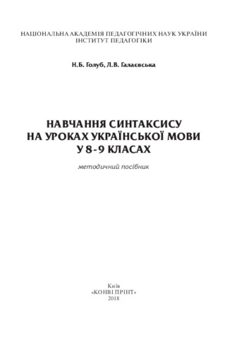 Голуб, Ніна Борисівна (orcid.org/0000-0002-3736-9296) and Галаєвська, Л.В. (2018) Teaching syntax in Ukrainian lessons in grades 8-9 . ТОВ «КОНВІ ПРІНТ, м. Київ, Україна. ISBN 978-617-7724-07-9