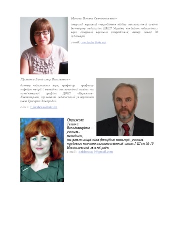 - Мачача, Тетяна Святославівна, Юрженко, В.В. and Стрижова, Тетяна Володимирівна (2018) Didactic and methodological analysis of current educational program for "labor education" for the basic school Трудова підготовка в рідній школі (2).