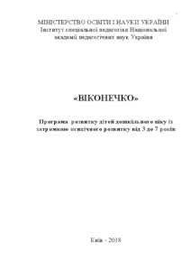 The program of development, training and upbringing of children of preschool age with delay of mental development "Viconechko" is the first component of scientific and methodological materials related to the modernization of the content of special preschool education in Ukraine and the humanization of its goals and objectives. The program reveals the essence of psychomotor, cognitive, speech, social development and peculiarities of the development of play, visual and constructive activity of children of preschool age with a delay of mental development. The main educational tasks are revealed, the content of pedagogical work is disclosed, advice is provided to parents, and the approximate results of educational work with preschool children with mental retardation of different age groups are determined. "Vykonechko" is the first state program of a new type, which reflects the requirements for the development, education and training of a child of preschool age with a delay in mental development. The program is intended for pedagogical workers of special preschool institutions, groups, educational complexes, parents, students and teachers of higher pedagogical educational institutions, which are concerned with the problem of training and upbringing of preschoolers with a delay of mental development.