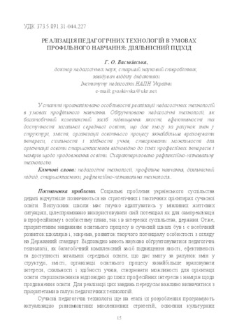 - Васьківська, Галина Олексіївна (2018) Implementation of pedagogical technologies in the conditions of profile training: activity approach Гуманітарний вісник Полтавського національного технічного університету імені Юрія Кондратюка (3). pp. 15-22. ISSN 2521-1579