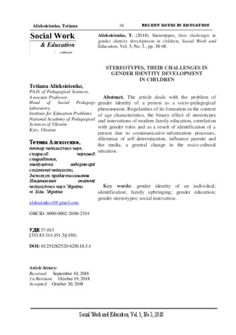 - Alieksieienko, T.F. (orcid.org/0000-0002-2060-2354) (2018) Stereotypes, their chellenges in gender identity development in children Social work and education, 3 (5). pp. 100-107. ISSN 2520-6230